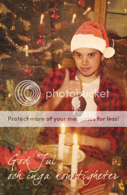 Sitter och fryser i mormor och morfars källare uppe i Gällivare. Alla kusinerna, mostrar, morbröder och släkt är samlade och imorgon ska det firas jul! Huset sover men inte jag. Inte heller lillebror som är ute på stan och kör raggen med gamla polare.. eller kusinernas katt som jamar efter sällskap. Det är skönt att vara hemma bland nära och kära, samtidigt som jag redan börjat sakna livet och gemenskapen borta på elevhemmet. Hade vi firat julen tillsammans där så tror jag att vår gode vän Bruno hade varit tomte, så snäll som han är! Därför bjuder jag nu på en bild och passar på att hälsa alla mina fina där borta en riktigt GOD JUL! KRAM/